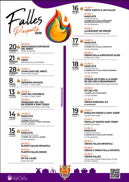 Entre els actes destacats figuren la Cavalcada del Ninot (28 de febrer), la despertà infantil (8 de març), el Cant de l’Estoreta i el Passejà del Foc (13 de març), el lliurament de premis (16 de març), l’Ofrena a la Mare de Déu i la Nit del Foc (18 de març) i els actes centrals del 19 de març en honor a Sant Josep. Les mascletaes es dispararan del 14 al 19 de març, convertint la pólvora en protagonista indiscutible.