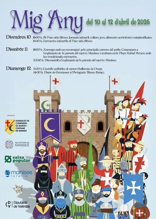 Tres dies d’activitats, música i ambient festiu per a tots els públics Tallers, jocs, entraetes i propostes familiars protagonitzen la celebració La festa de Moros i Cristians de Manises celebra el seu Mig Any entre els dies 10 i 12 d’abril, amb un programa variat d’activitats pensades per a totes